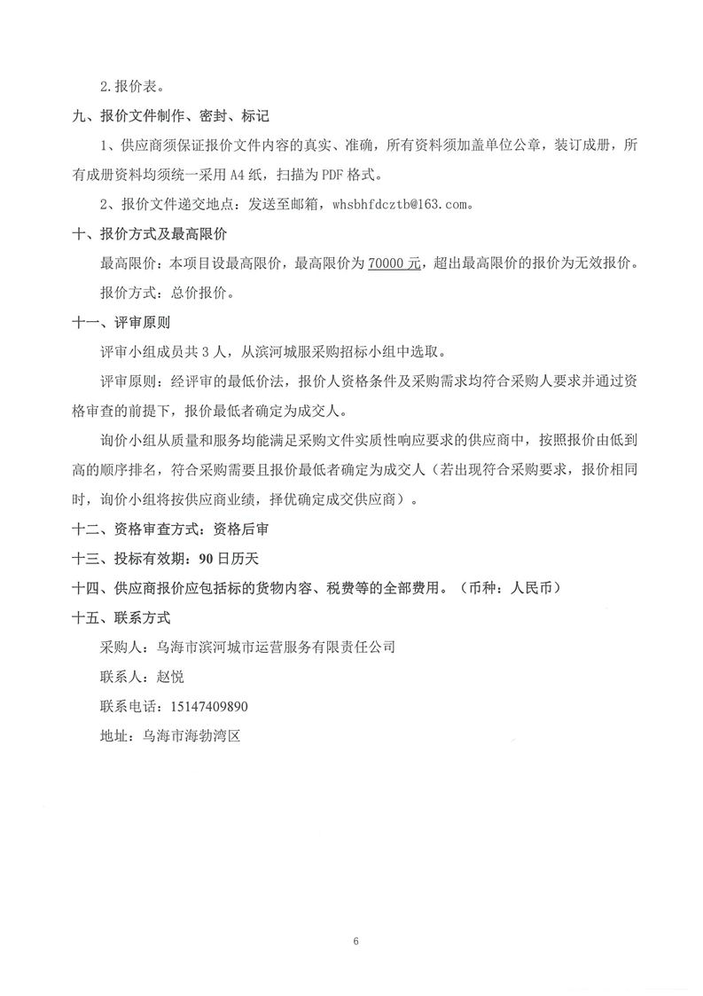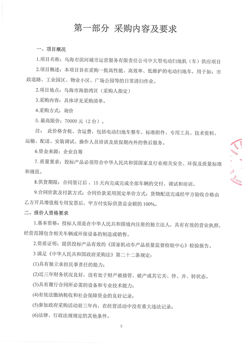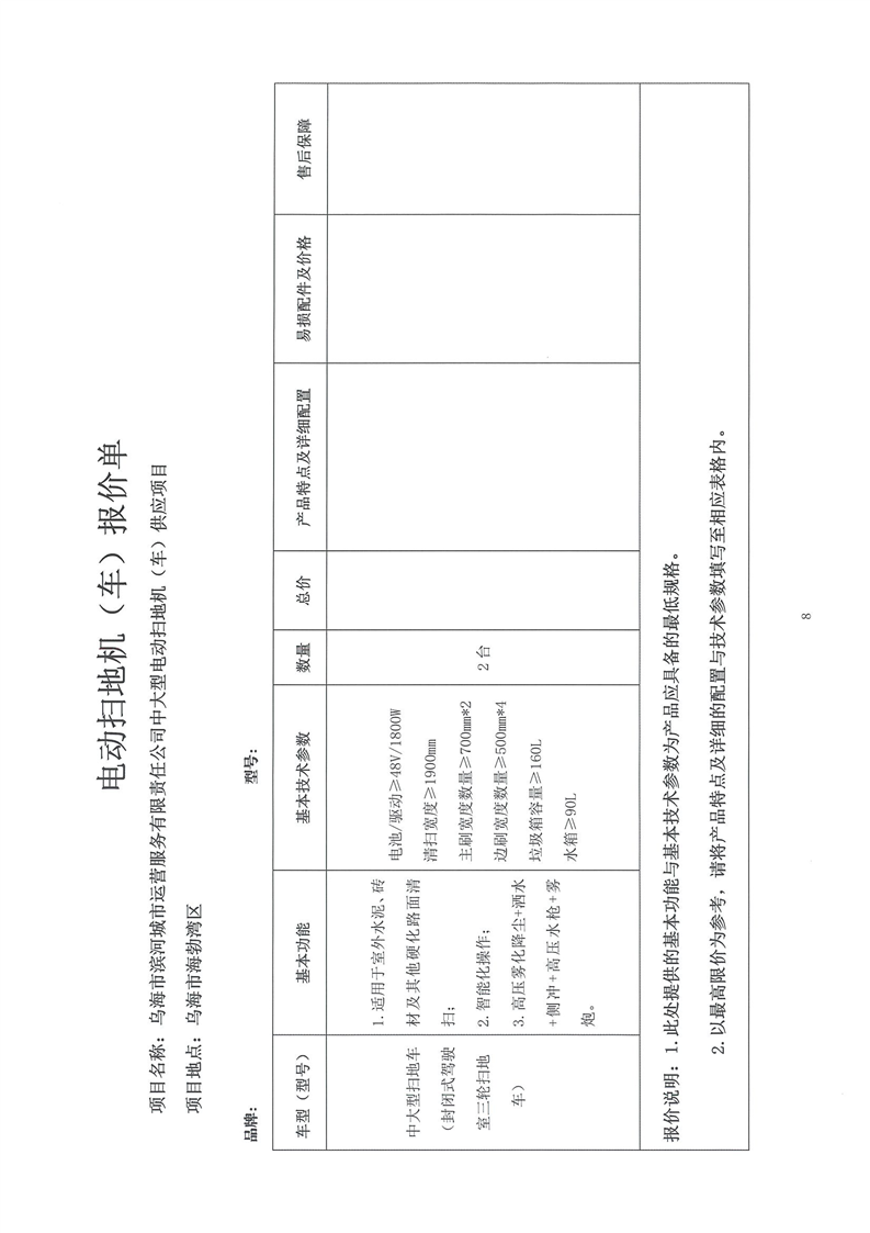 烏海市濱河城市運營服務(wù)有限責(zé)任公司中大型電動掃地機(jī)(車)供應(yīng)項目詢價文件