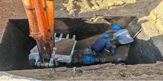電焊組的師傅們頭戴面罩,手持焊槍,瞬間火花四濺,在黑暗中綻放出奪目光芒,熟練地進(jìn)行切割與焊接工作,其他人員則全力投入到拆卸工作中,他們齊心協(xié)力,將DN800蝶閥、DN800鑄鐵乙管、三通、伸縮器等部件逐一拆卸。盡管汗水濕透了衣衫,雙手被工具磨出了水泡,但沒有一個人喊累,所有人的目光都堅(jiān)定地聚焦在搶修任務(wù)上。
