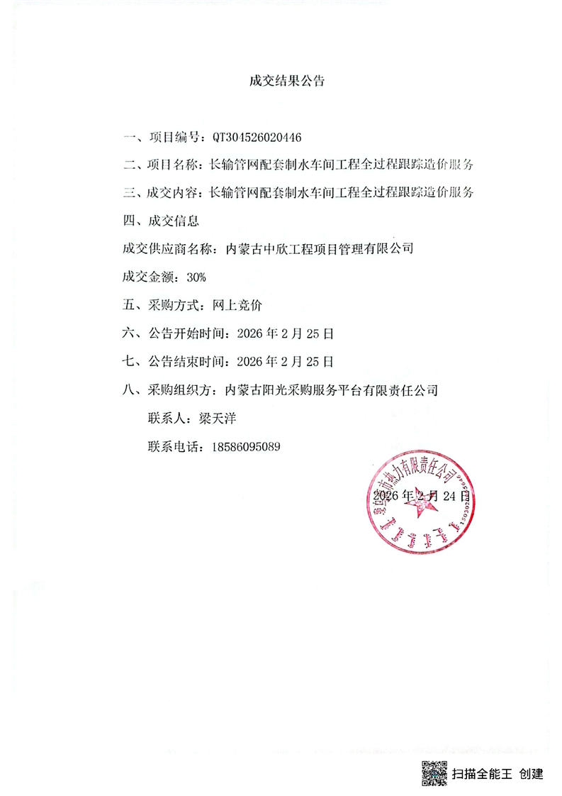 - 2026-02-25長輸管網配套制水車間新建工程監(jiān)理服務采購項目成交結果公告